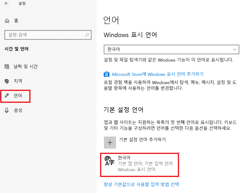 그다음 왼쪽의 '언어'를 클릭 후 오른쪽의 '한국어'를 클릭해 줍니다