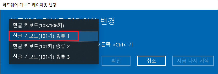 그리고 이렇게 '한글 키보드(101 키) 종류 1'을 선택해주시면 됩니다