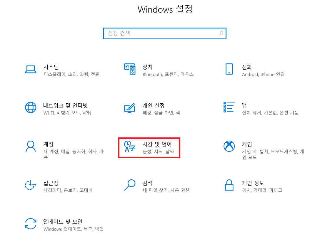 Windows 설정에 들어온 다음으로는 '시간 및 언어'를 선택해 줍니다