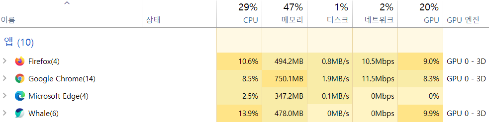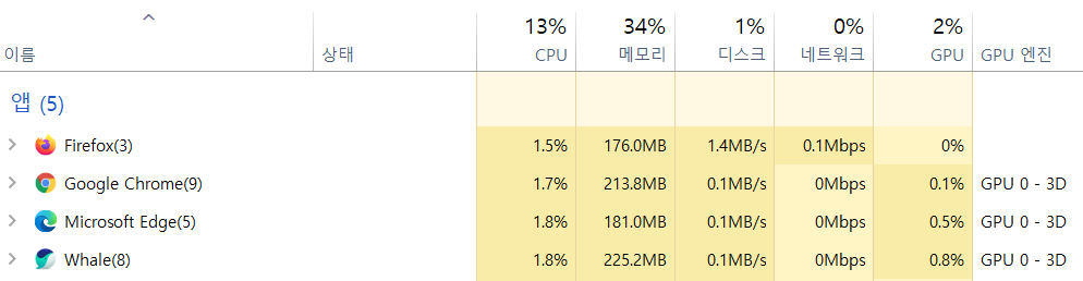 단순 인터넷 서핑은 파이어폭스>엣지>크롬>웨일 순으로 좋은 사용량을 보여주네요