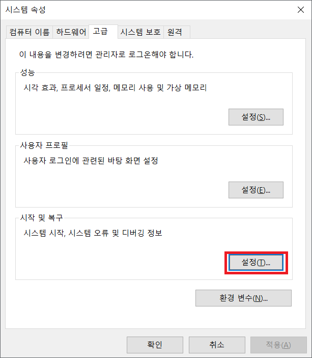다음으로는 시스템 속성-시작 및 복구-설정(T)로 들어가 줍시다!