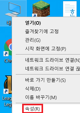 바탕화면의 '내 컴퓨터'를 오른쪽 마우스 클릭한 뒤 '속성(R)'을 눌러줍니다