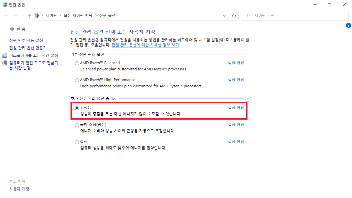 Intel CPU를 쓰시는 분은 고성능에 체크해주시면 되겠습니다