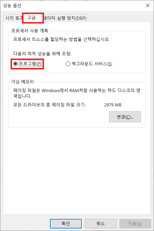 다음의 최적 성능을 위해 조정에 '프로그램(P)'를 선택해 주고