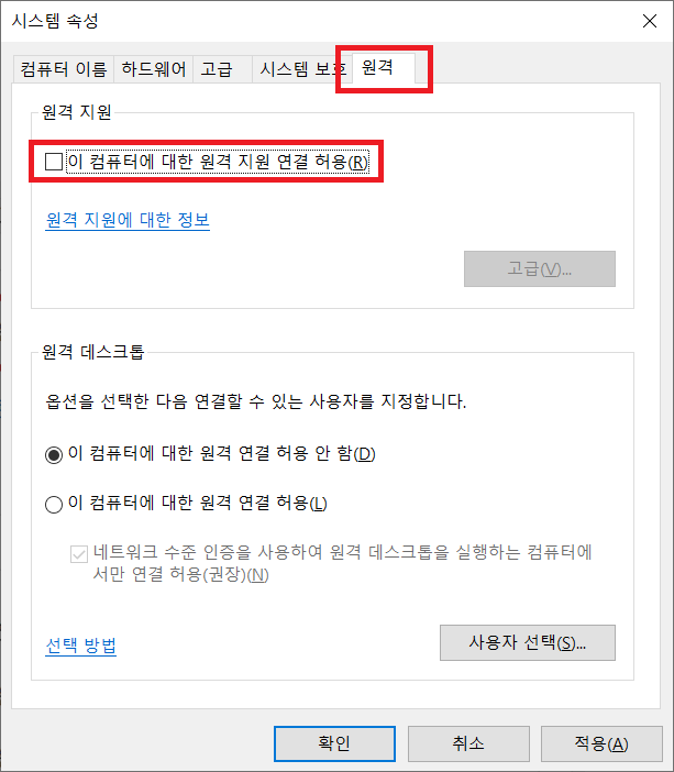 '이 컴퓨터에 대한 원격 지원 연결 허용(R)'을 체크 해제!!