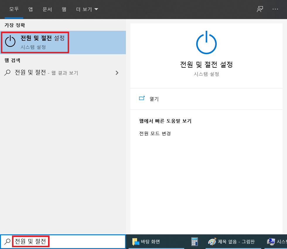 왼쪽 하단에 있는 검색에 '전원 및 절전'을 입력한 후