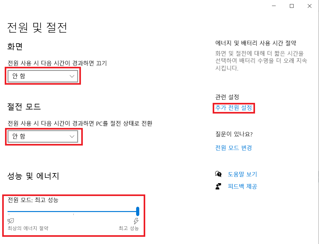 전원 모드 : 최고성능 으로 설정해 줍니다!