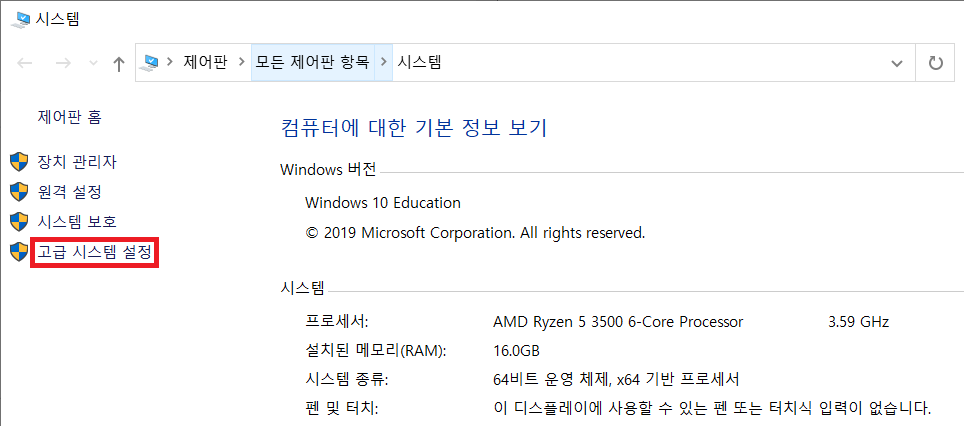 왼쪽 메뉴 중에서 '고급 시스템 설정'을 클릭해 줍니다