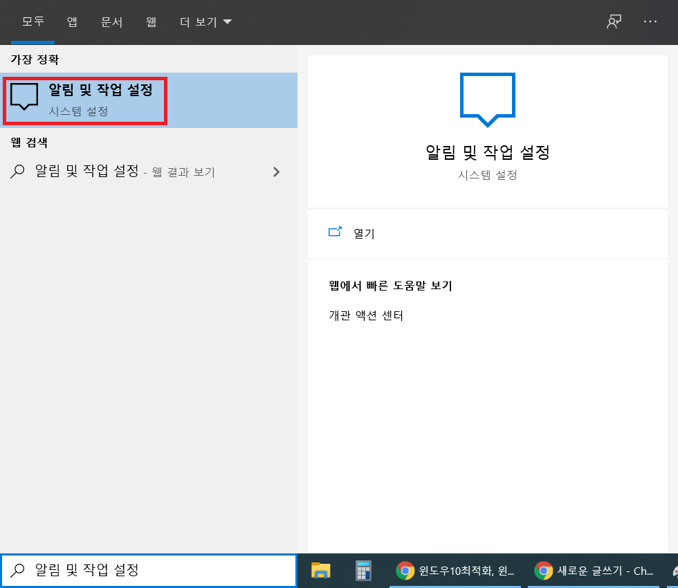 화면 왼쪽 및 검색창에서 '알림 및 작업 설정'을 입력해주고
