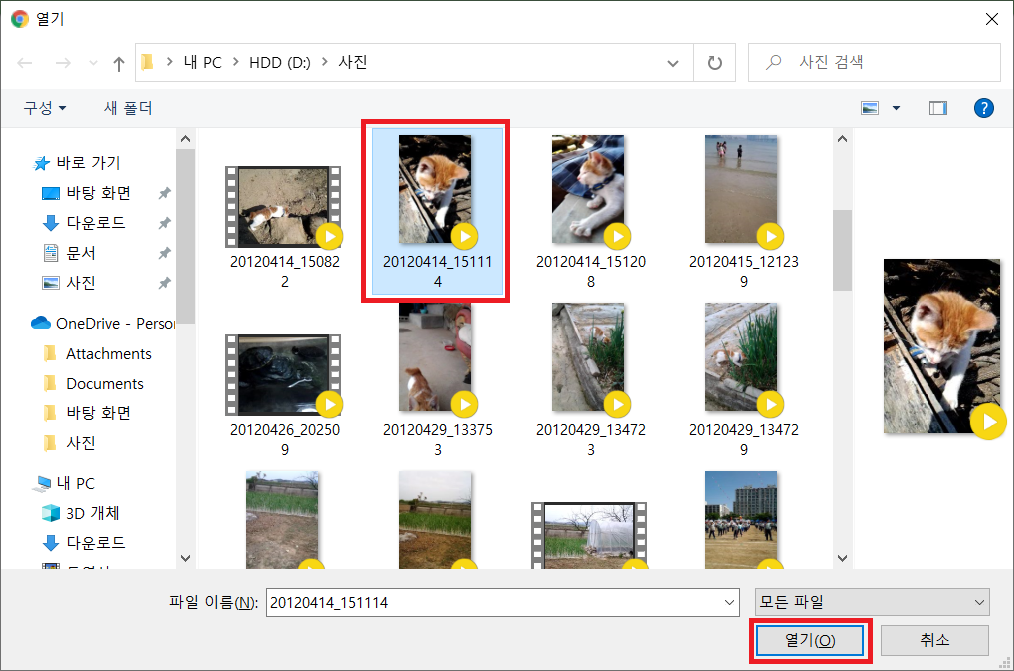 다음과 같이 자신이 원하는 파일을 선택 후 열기(O) 버튼을 눌러줍니다