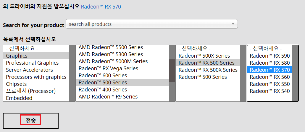 다음으로 자신의 컴퓨터에 설치되어 있는 그래픽카드를 찾은 후 전송을 눌러주고 설치를 해주자