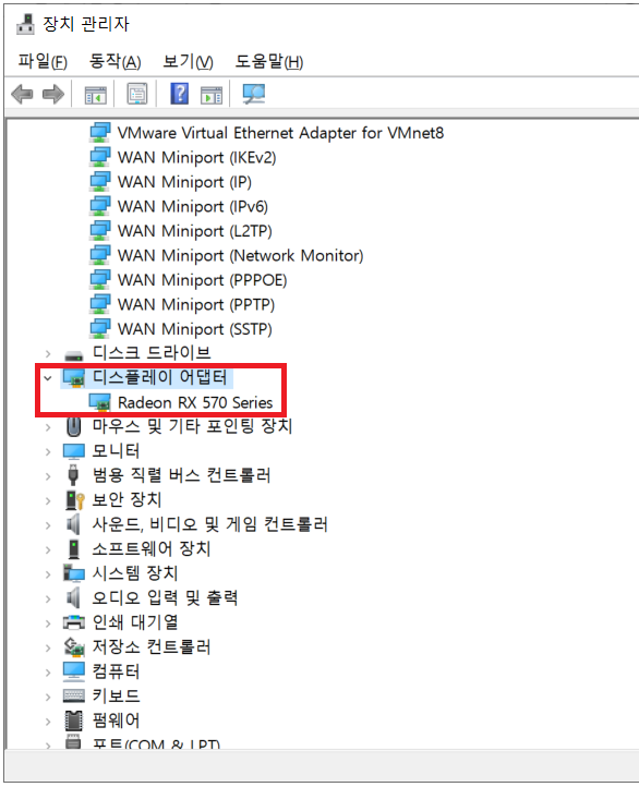 디스플레이 어댑터에서 자신의 그래픽카드 종류를 찾을 수 있다