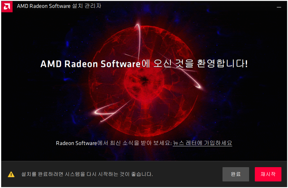 설치를 완료하고 재시작버튼을 눌러주면 컴퓨터가 재시작되면서 설치가 완료되게 된다