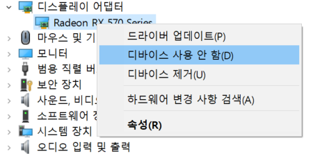 디바이스 사용 안 함(D) 버튼을 눌러 외장그래픽카드를 사용을 막아준다