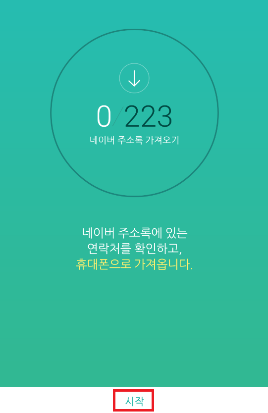 이제 '시작' 버튼을 눌러 네이버상에 있는 전화번호 주소록을 내 휴대폰으로 가져오도록 한다