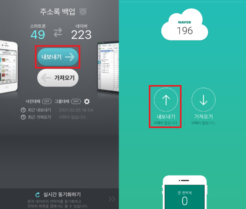 우선 '내보내기' 버튼을 눌러서 자신의 휴대폰에 있는 전화번호부를 네이버 상으로 옮겨주자