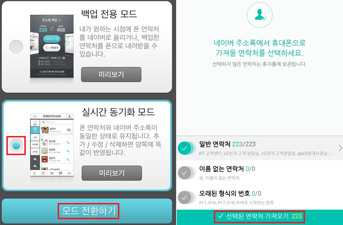 이제 아이폰은 '모드 전환하기' 안드로이드는 '선택된 연락처 가져오기' 버튼을 눌러서 설정을 완료해주자!