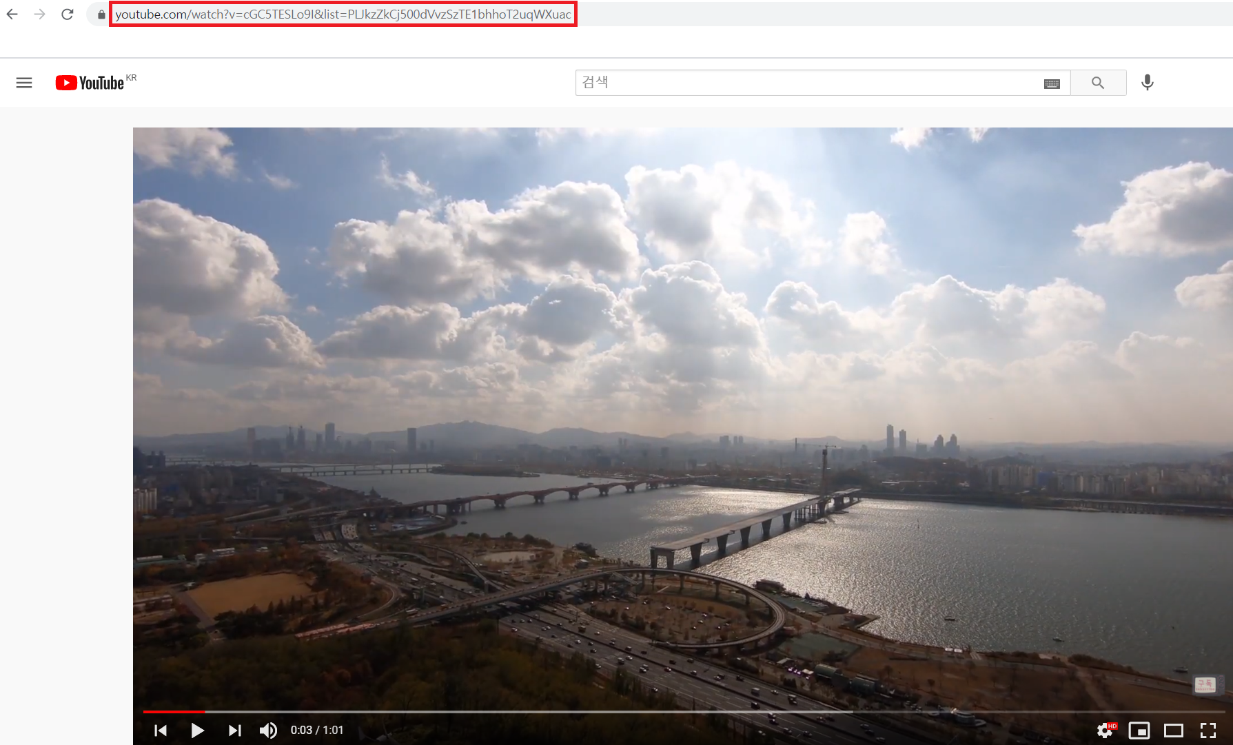유튜브에서 원하는 동영상이나 음악을 튼 뒤 왼쪽 상단의 주소를 클릭해주고 통째로 복사해주자