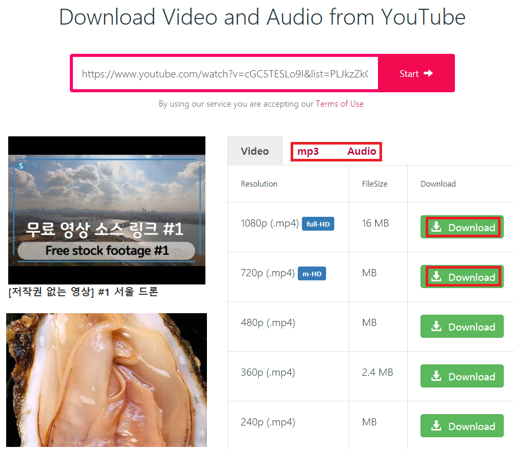 음원이나 노래의 추출을 원한다면 mp3, Audio 버튼을 눌러준 후 거기서 다운로드를 하면 되겠다