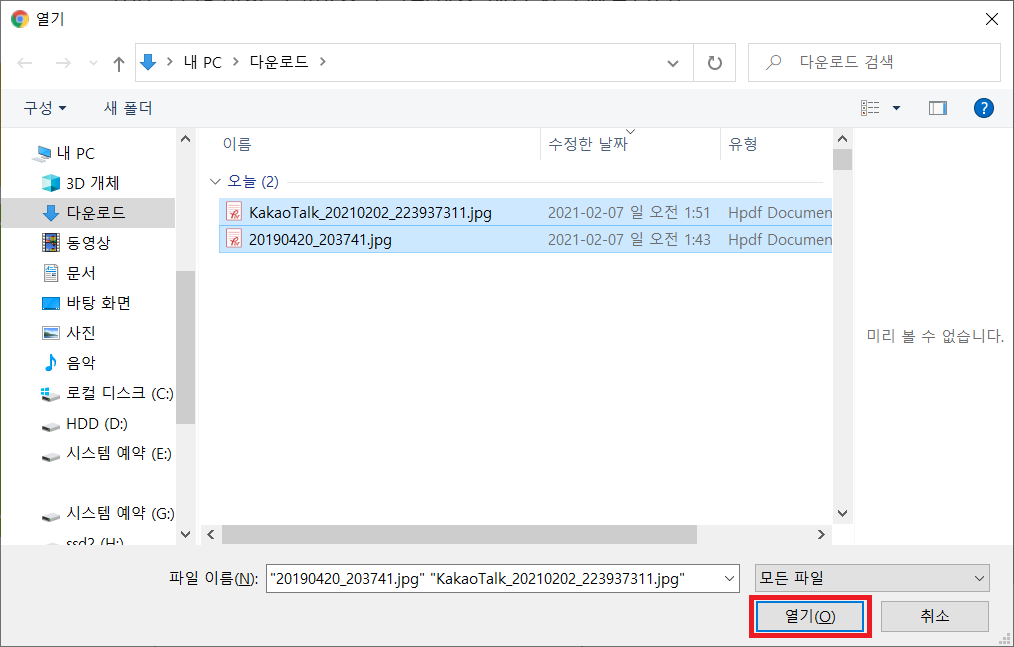 이렇게 자신이 원하는 파일을 동시에 여러개 선택할 수 있다