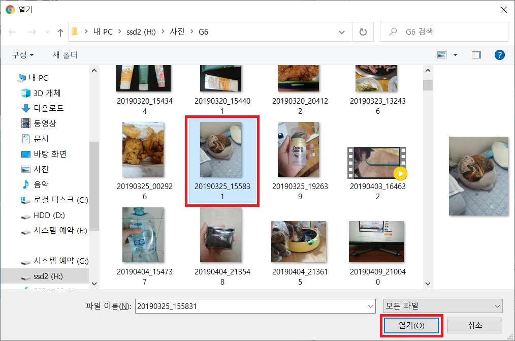 그 후 자신이 원하는 사진파일을 한개 선택하고 '열기(O)'를 눌러준다