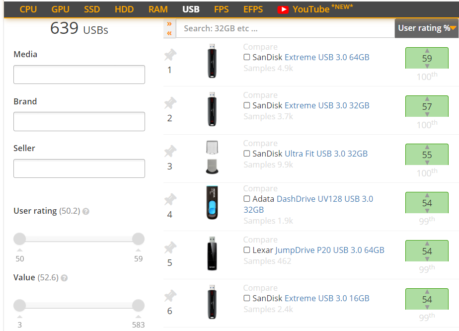 역시 USB의 대표회사인 SanDisk가 상위권을 대부분 차지하는 모습을 볼 수 있다