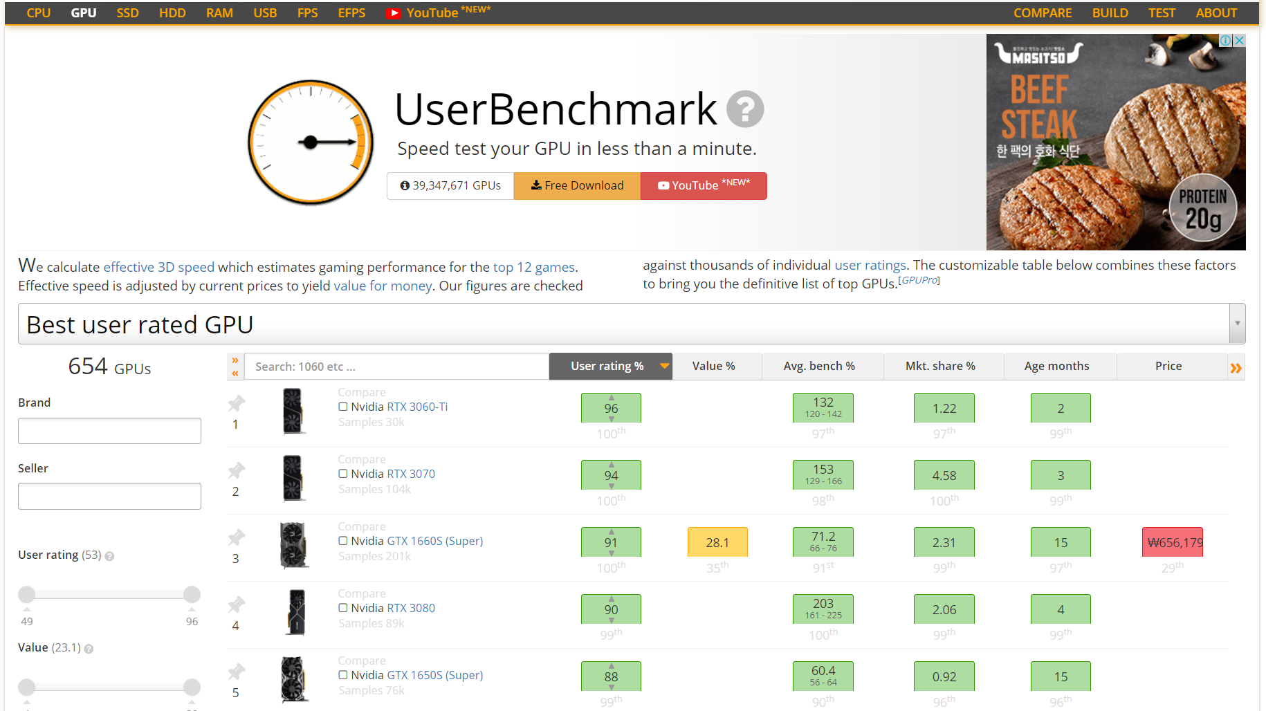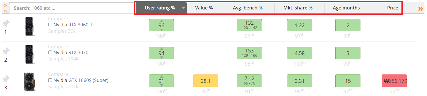 적당한 돈으로 좋은 가성비의 그래픽카드를 사고 싶다면 'Best Value'를 클릭해서 가성비 순위를 살펴보면 될 것이다