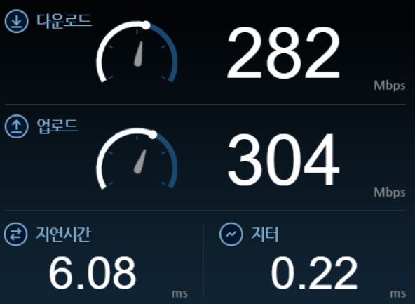 다운로드 282 Mbps, 업로드 304 Mbps, 지연시간 6.08ms로