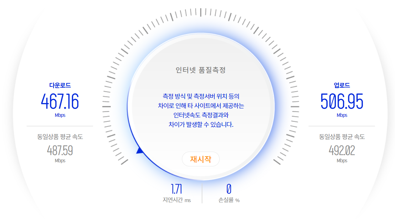 다운로드 467.16 Mbps, 업로드 506.95 Mbps, 지연시간 1.71ms이다