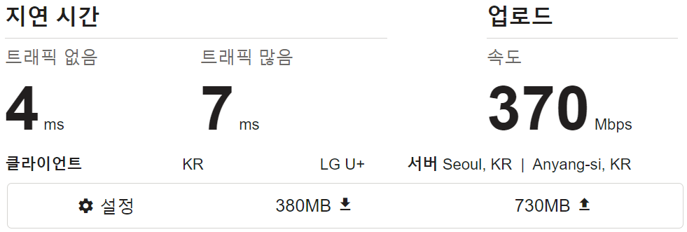 다운로드 470 Mbps, 업로드 370 Mbps, 지연시간 4~7ms로 무난한 대칭형 인터넷 속도를 보여준다