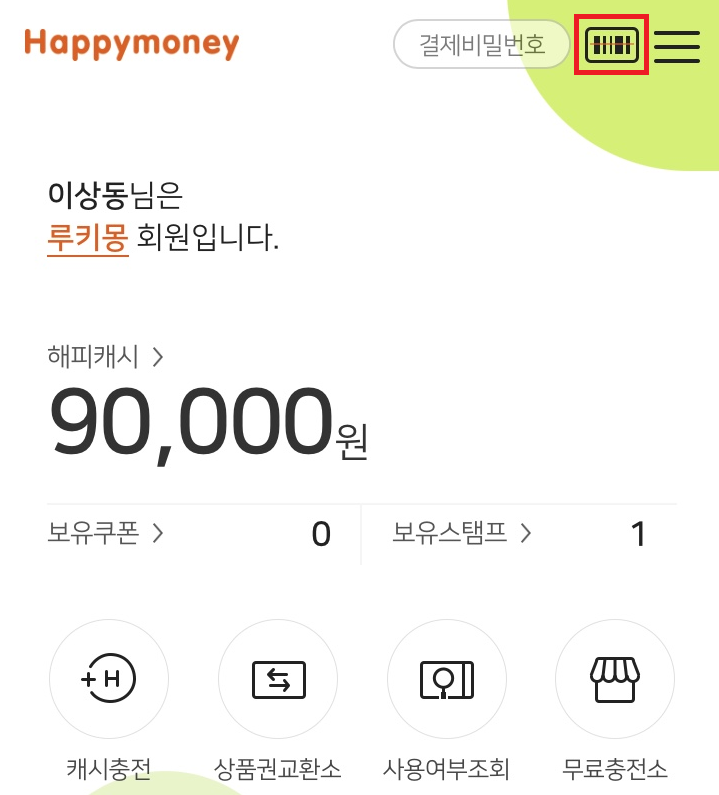 모바일 상품권은 이렇게 해피머니 앱에서 오른쪽 상단의 바코드 모양을 클릭해 바코드를 직원에게 보여주면 된다