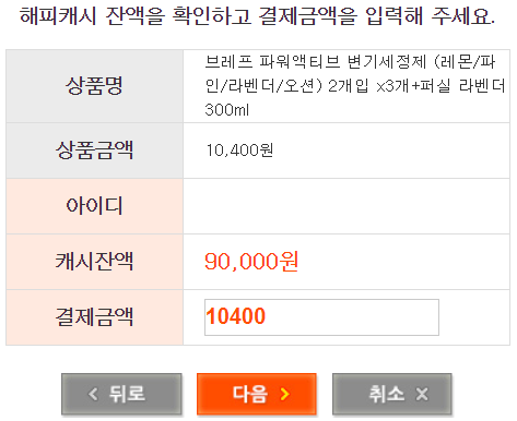 그럼 보기와 같이 해피캐시란에 입력한 금액이 들어오게 되고