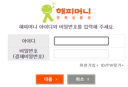 '해피캐시'버튼을 눌렀다면 이렇게 해피머니 문화상품권의 로그인 창이 뜨므로 로그인을 해주자