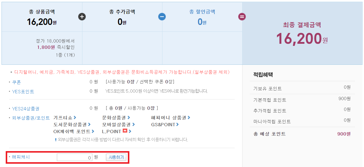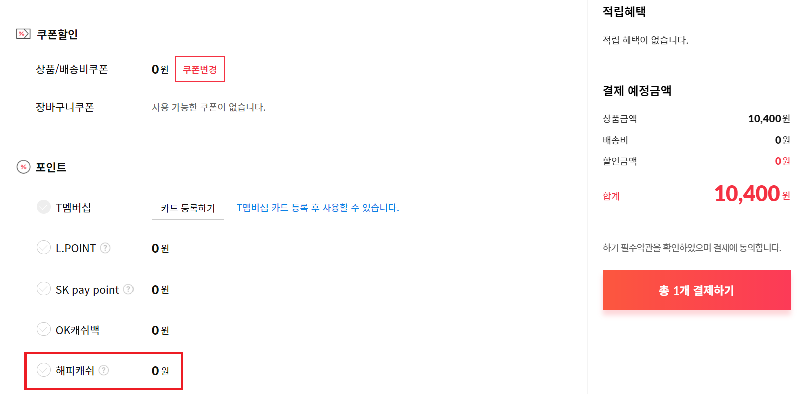 그리고 구매 화면에서 스크롤을 내리다면 포인트 탭에 '해피캐시'란이 생긴 것을 확인할 수 있다