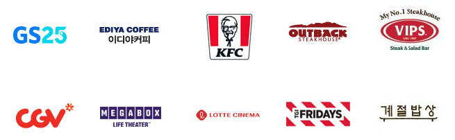 GS25, 이디야커피, KFC, 아웃백, 빕스, CGV, 메가박스, 롯데시네마, 프라이데이스, 계절밥상 등..