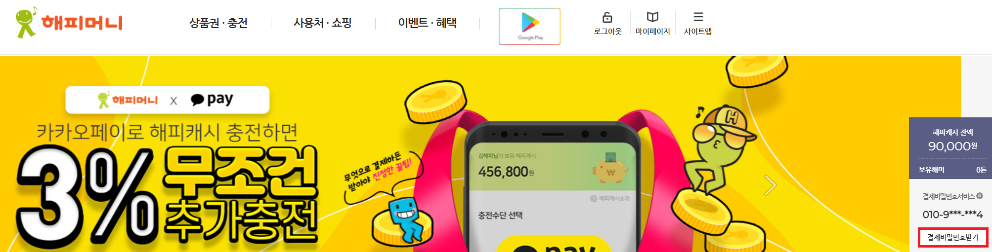 결제 비밀번호는 해피머니 홈페이지에서 '결제 비밀번호 받기'버튼을 클릭하면 휴대폰으로 날아오게 된다