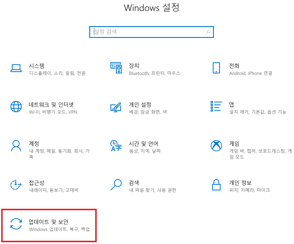 우리는 '업데이트 및 보안'을 더블클릭해 탭으로 들어가 주자