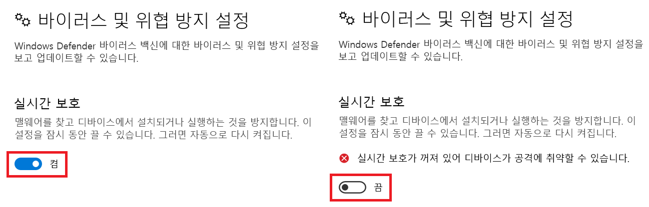 바이러스 및 위협 방지 설정 관리에서 우리가 건드려 주어야 할 것은 '실시간 보호 체크 버튼'이다
