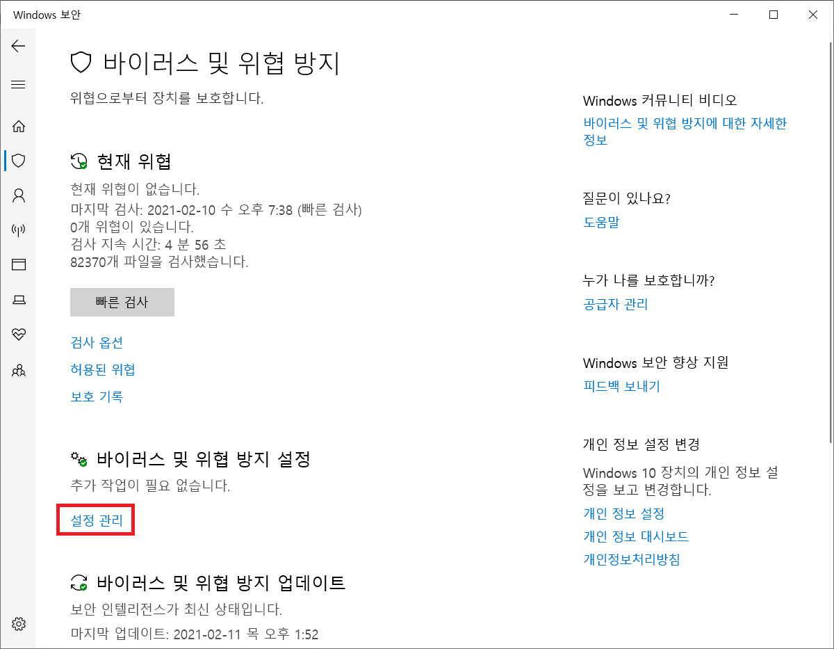 그리고 이제 바이러스 및 위협 방지 탭에 들어왔다면 '설정 관리'를 클릭 해 또 들어가 주겠다