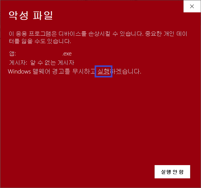 특정 파일을 실행하려고 했더니 이런 경고 알림 창이 오른쪽 하단에 떴다