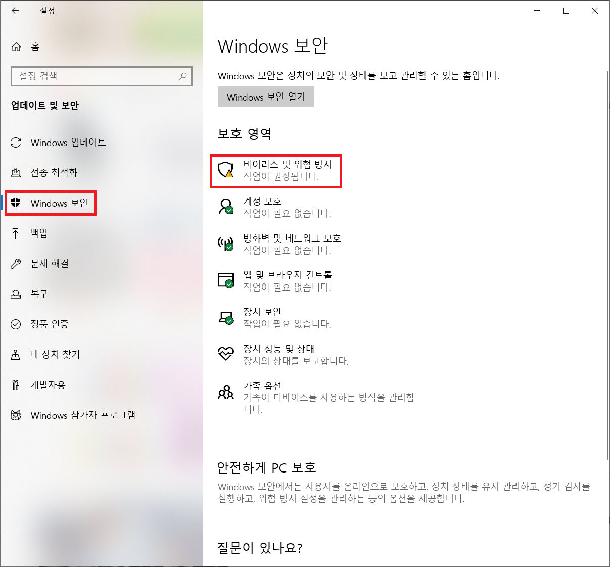자 이제 왼쪽 업데이트 및 보안 탭에서 'Windows 보안'을 클릭해 주고