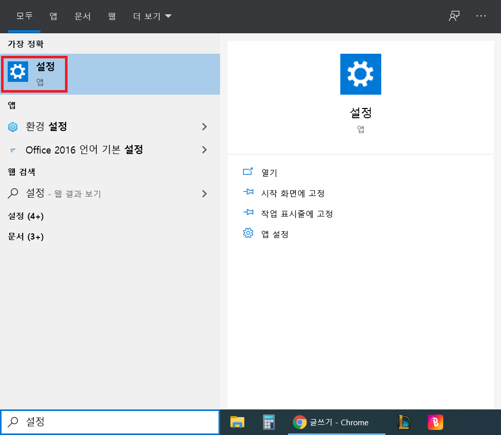 우선 윈도우 화면 상 왼쪽 하단의 검색창에 '설정'을 입력해주고 위 그림처럼 설정을 클릭해준다