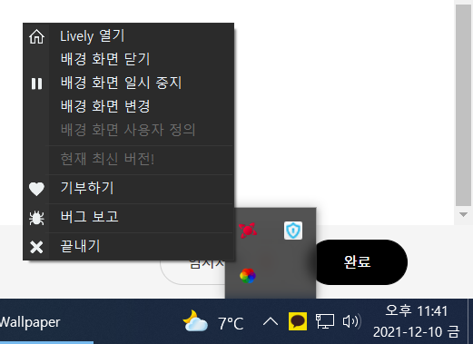 프로그램 아이콘을 우측 마우스 클릭해서 Lively 열기를 해야 창이 꺼지고 완료가 됩니다
