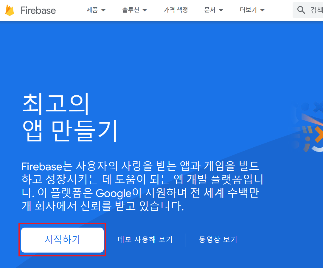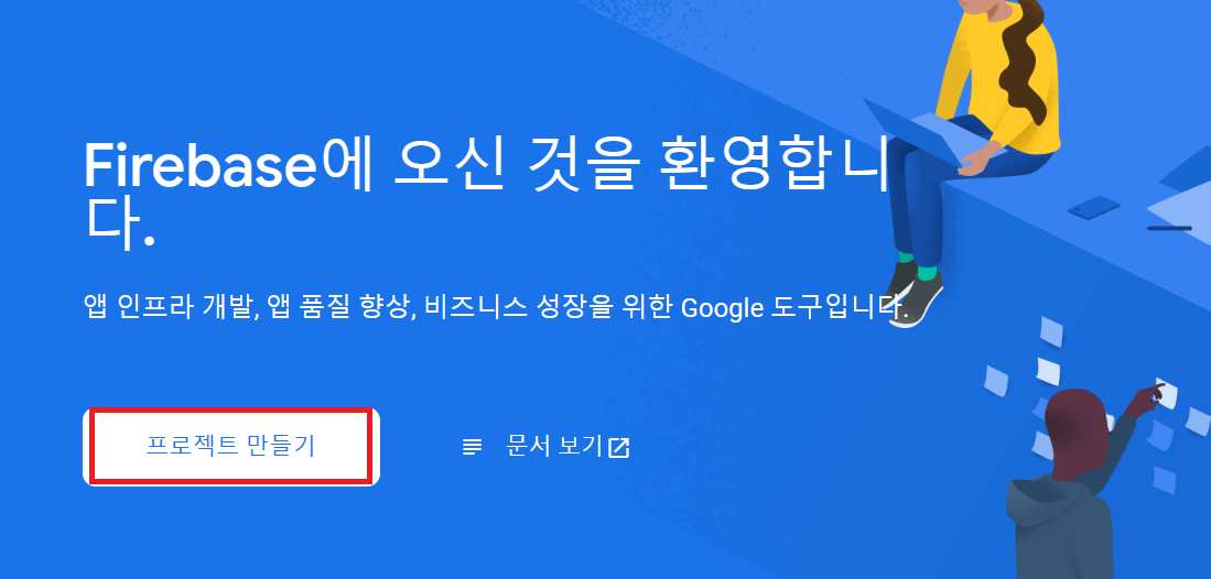 다음 파이어베이스 홈페이지에서 시작하기 -> 프로젝트 만들기로 들어가 줍니다