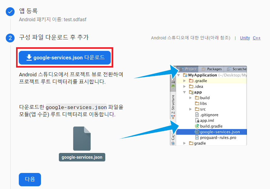 다음으로는 google-services.json 파일을 받아 app폴더에 넣어주도록 합니다