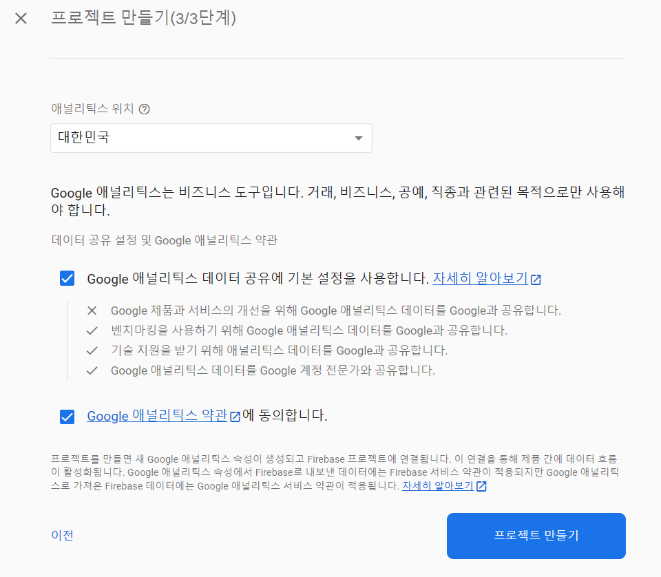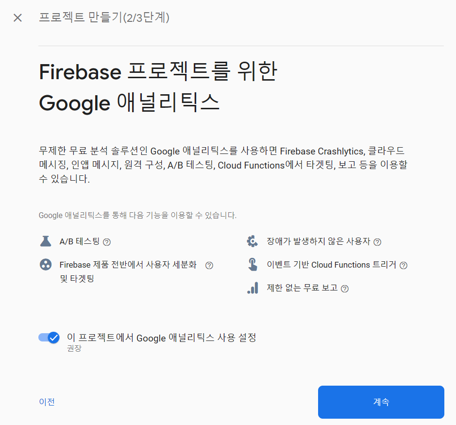 다음은 파이어베이스를 이용하는 자료에 대한 분석기능을 쓸 것인지 묻는 창이 뜨게 되는데