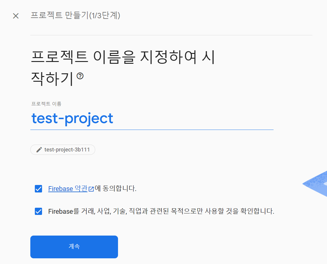 다음과 같이 원하는 프로젝트 이름을 입력하고 체크란에 체크 후 계속 버튼을 눌러줍니다