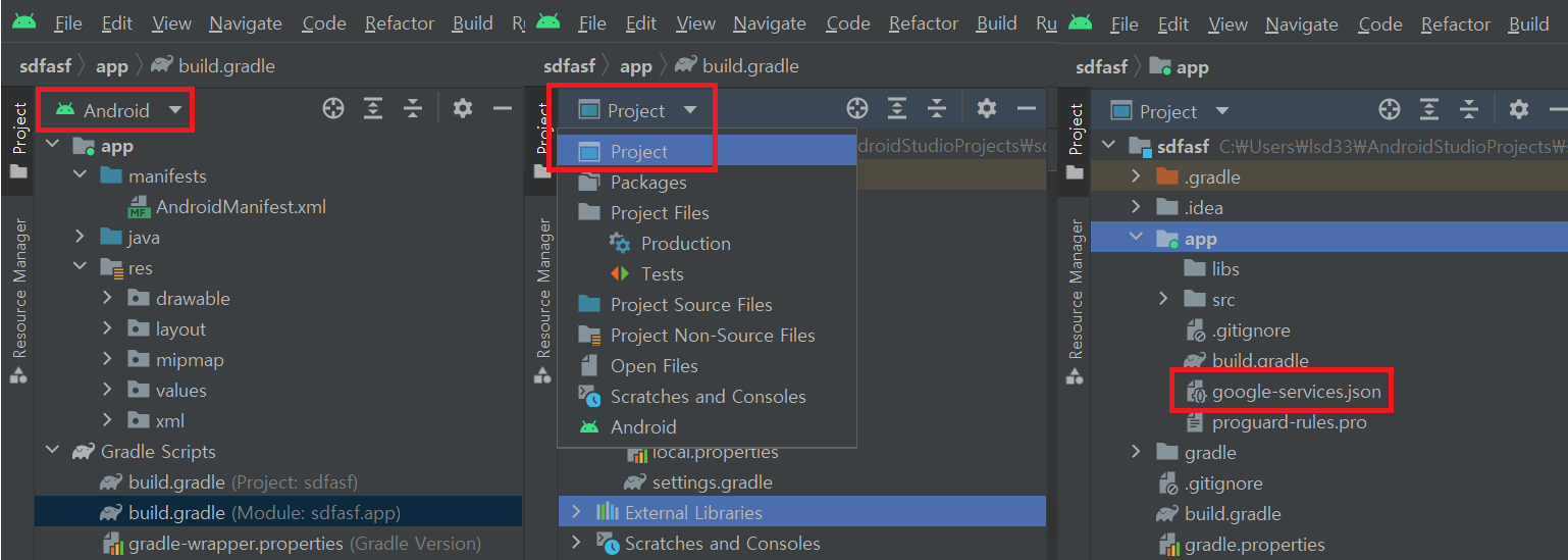 Android -> Project버튼을 누른 다음 app폴더를 찾아 google-services.json 파일을 넣어주도록 합니다