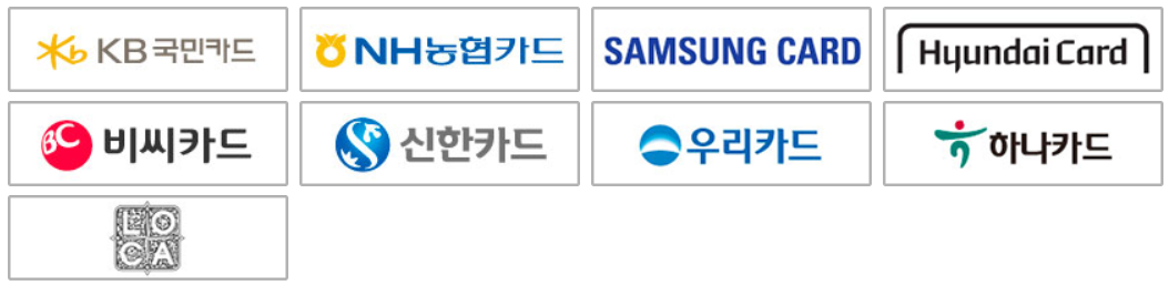 국민카드, 농협카드, 삼성카드, 현대카드, 비씨카드, 신한카드, 우리카드, 하나카드, 롯데카드 가 있네요