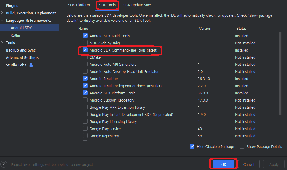 Android SDK Command-line Tools (latest) 체크 → Apply